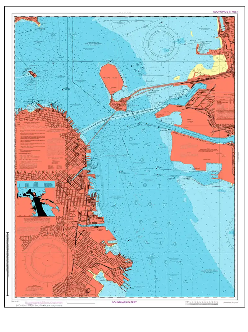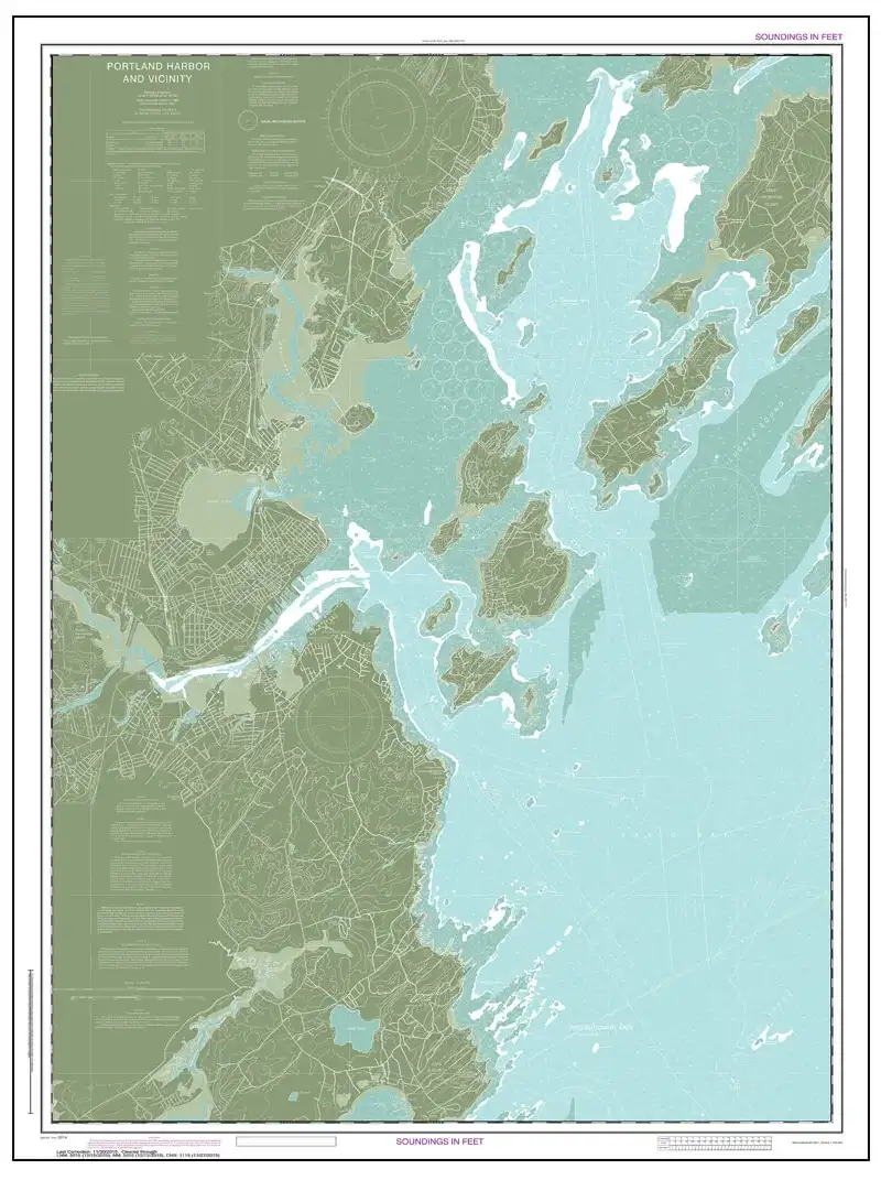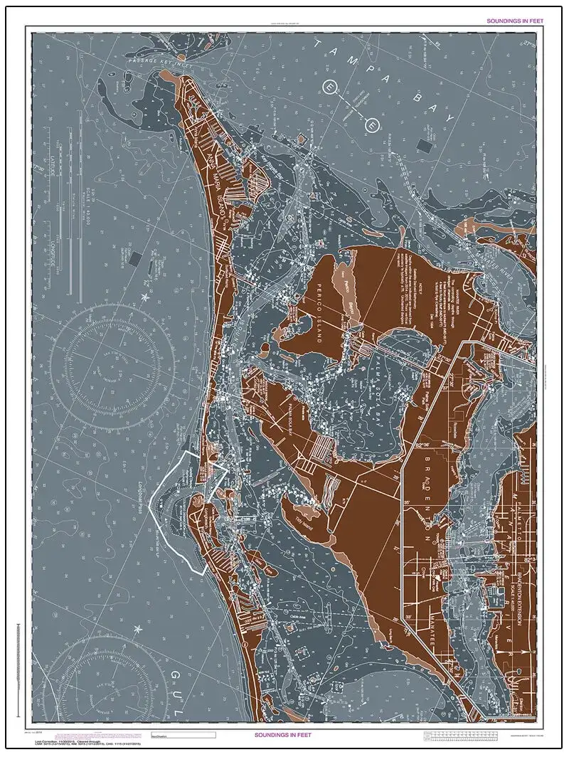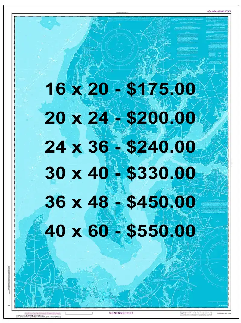 Create a custom nautical chart to match your decor. They make a stunning display when framed in your home or office. We can't show every chart available here, but any chart is available in any size and color. Colors can be selected three ways. You can send us a screen shot of a project you like from our site, choose a pre-set color group (or combination) from our Colors page, or select 4 custom colors from a Pantone color sheet we will send you. Any chart can also be made into Nautical Chart Wallpaper. All charts are available in Standard Chart colors as well. Color changes do not affect price. Simply use the "Request Free Layout" button at the top or bottom of the page and let us know what chart area you are interested in. Including your address will let us select the best chart for your area. Let us know what size you are looking for, and in what colors. We will set up a layout for you and sent it back straight away with pricing.
