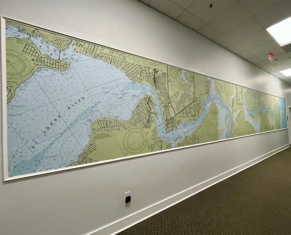 Any nautical chart or map can be turned into nautical chart wallpaper! The nautical chart wallpaper can be cropped to contain areas of specific interest to you. Just let us know your location in the form below. Choose one of our existing color palettes for your project, or choose any 4 custom colors you prefer! Custom colors are available for any project at no additional cost, so you can design the project to match your decor. Look through the color options using the links below, give yourself some time for this one... The wallpaper can also be printed in the standard chart colors. We have 30 years experience in large scale output, our wallpaper output is the highest quality in the industry. When your artwork is created we take great care in setting it up to minimize any waste caused by odd angles and unique wall layouts which in turn lowers your total project cost!